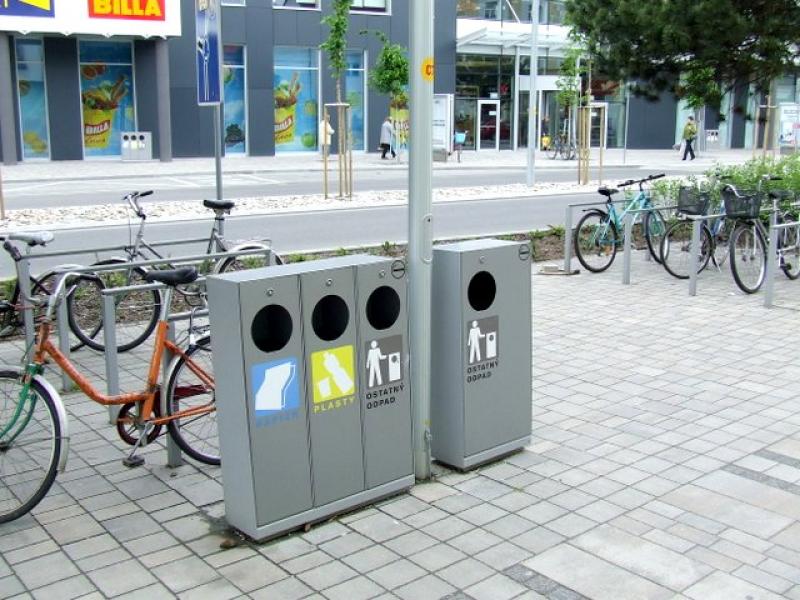 V centre mesta sú rozmiestnené na uliciach koše na separovaný zber odpadov.